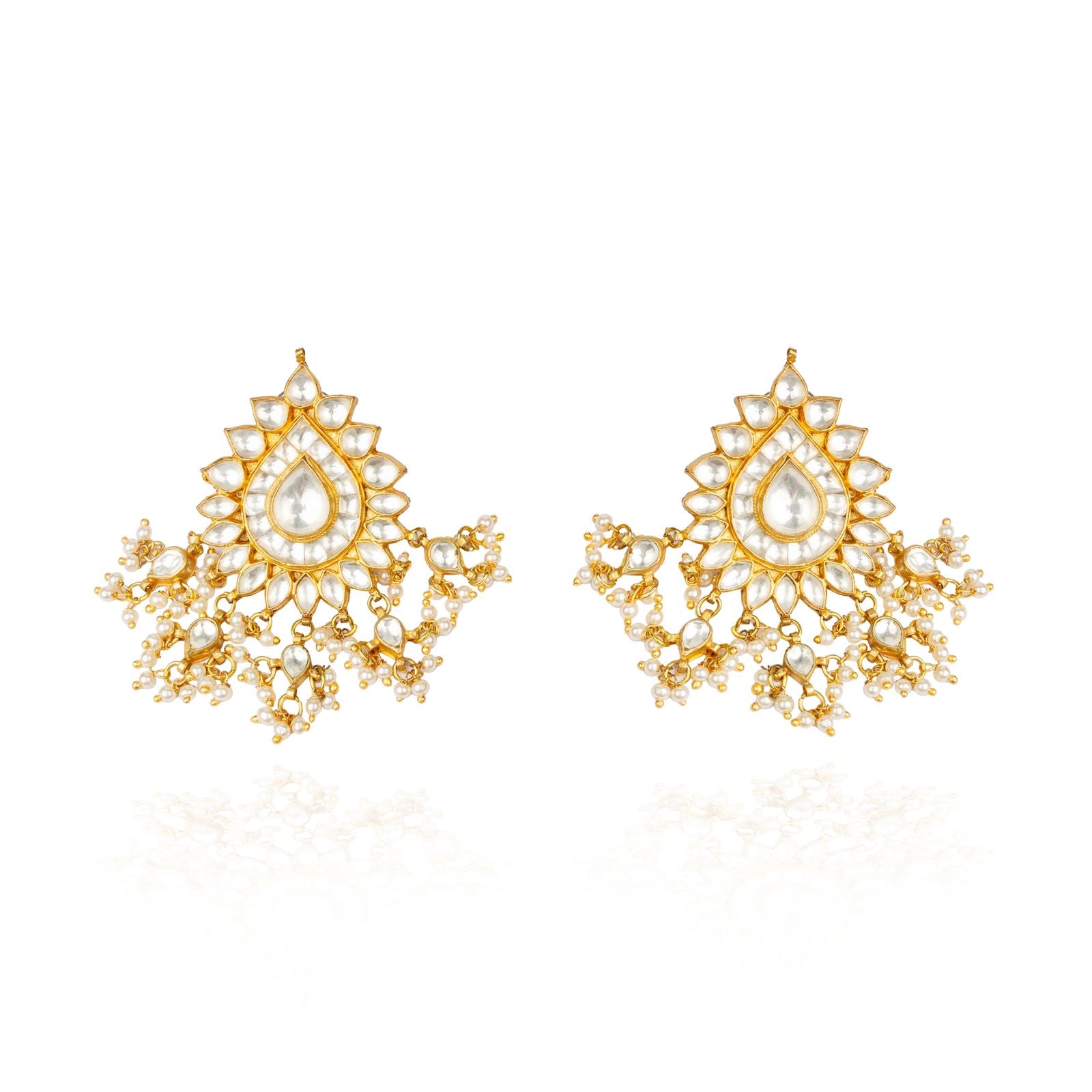 These exquisite Aakarshan earrings are a testament to traditional Indian craftsmanship. Featuring a teardrop-shaped centerpiece surrounded by a halo of smaller, intricately set white Kundan, the earrings are adorned with delicate goldwork and embellished with dangling pearls. The combination of gold, polki stones, and pearls creates a stunning visual effect, making these earrings perfect for formal occasions, weddings, or any special event where traditional elegance is desired. Against a crisp white background, these earrings exude luxury and sophistication.