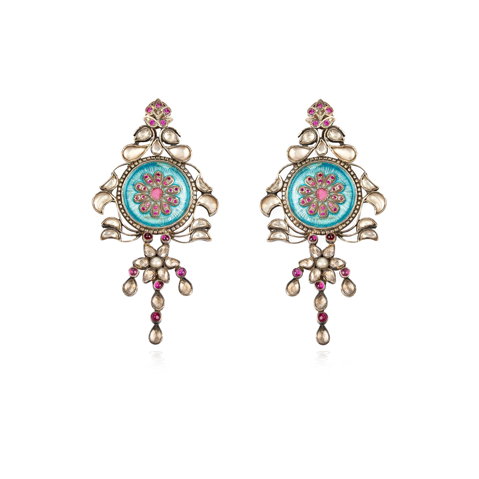 These handcrafted earrings feature a radiant burst of Turkish blue enamel at the center, intricately detailed with delicate crystal accents and studded rhodolite stones. The ornate floral motif is framed by vintage gold-dipped sterling silver, lending a regal, heirloom appeal. Accents of rhodolite continue throughout the piece, adding a soft pop of pink that contrasts beautifully with the cool blue enamel. Perfect for festive occasions, evening gatherings, or as a timeless statement accessory.